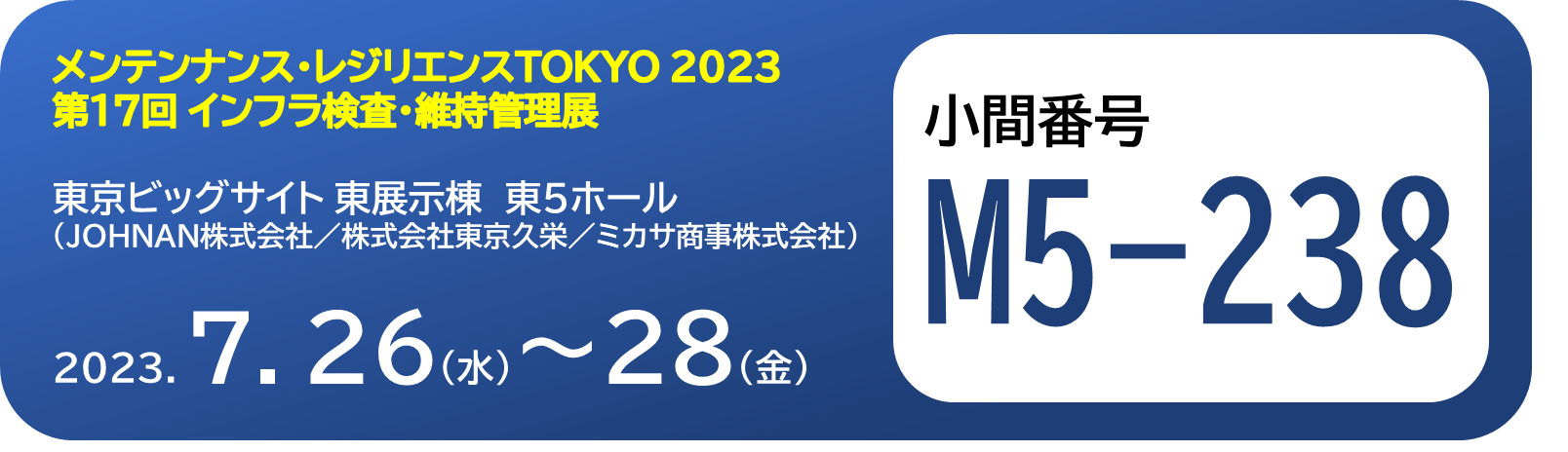ROV MOGOOLシリーズの販売を行う JOHNAN株式会社(京都府宇治市:代表取締役社長兼CEO 山本 光世)は、取放水設備の設計・施工、環境コンサルタントや水中メンテナンスを行う株式会社東京久栄(東京都千代田区:代表取締役社長 髙月 邦夫)、ROV MOGOOLシリーズ及びHy-CaTの販売店であるミカサ商事株式会社(大阪府大阪市:代表取締役社長 中西 日出喜)と2023年7⽉26⽇(⽔)〜28⽇(金)に開催されるメンテナンス・レジリエンスTOKYO2023に出展します。