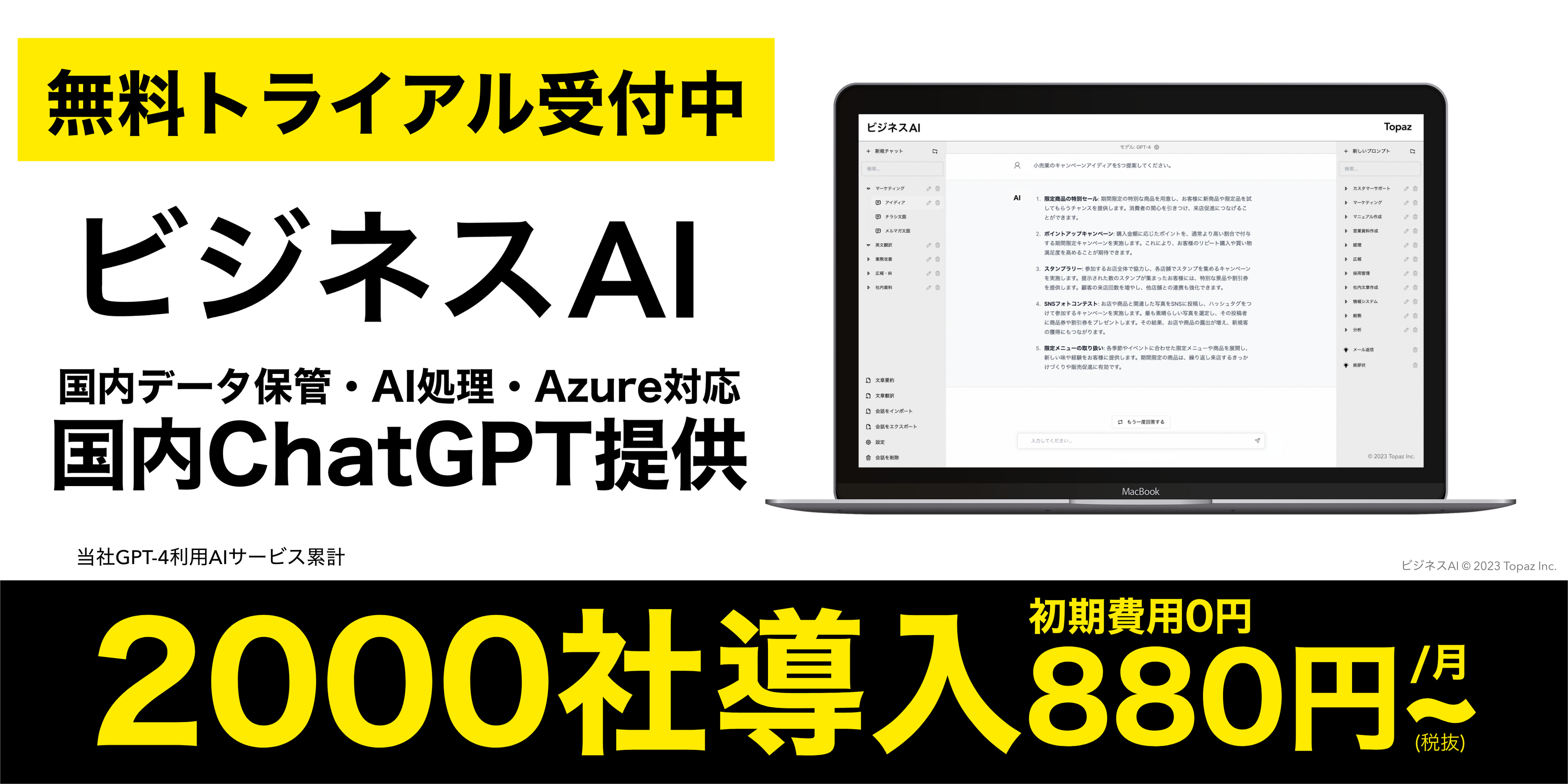 下記、日本国内でChatGPTをご利用いただける「ビジネスAI」のご紹介となります。