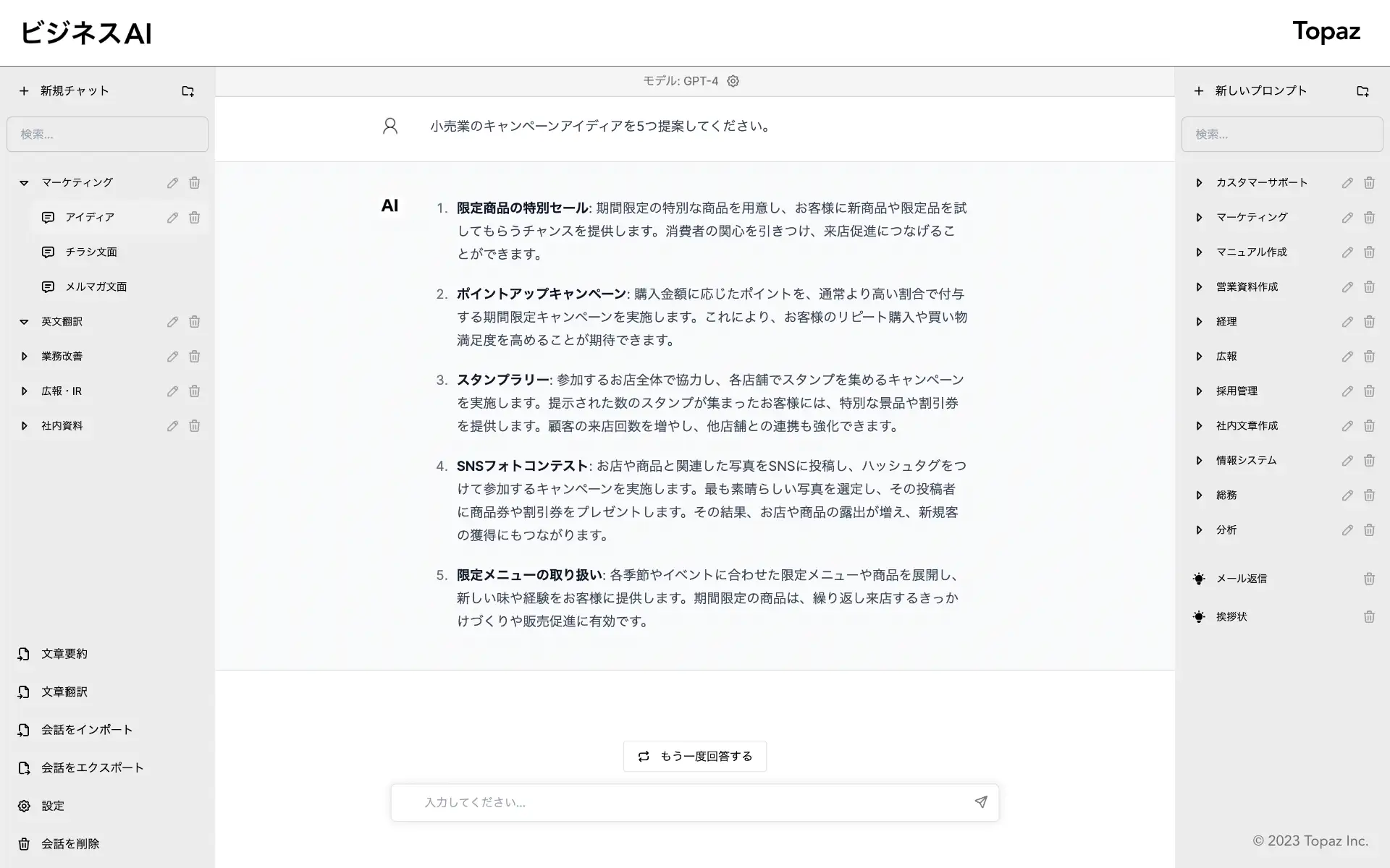 OpenAI社ChatGPT/GPT-4の他、日本初!8万文字対応のTopaz Pro AIがご利用いただけます。