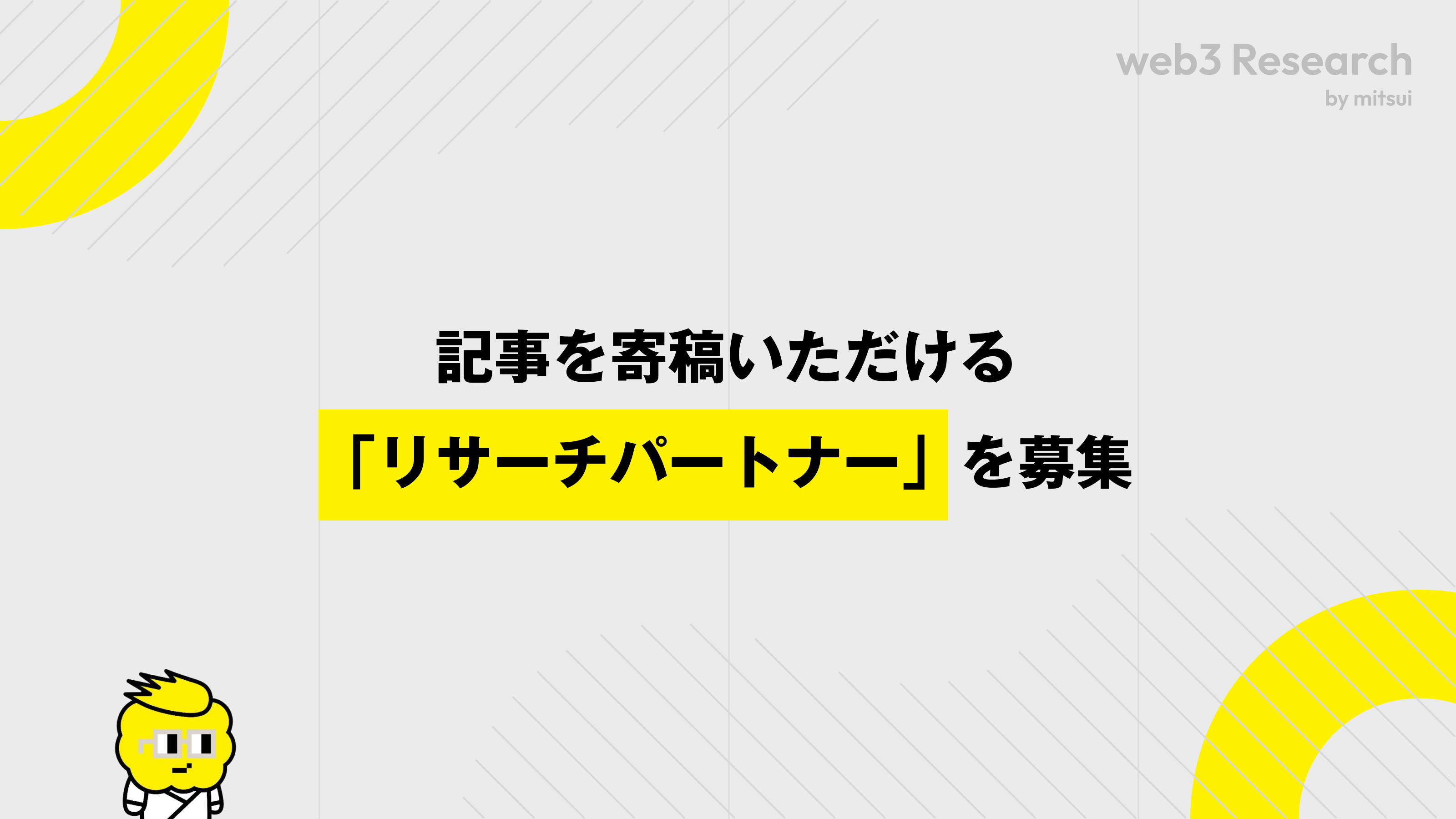 現在の「web3 Research JAPAN」は全ての記事を弊社代表のmitsuiが執筆していますが、より幅広い範囲での記事の提供を検討しており、この度「リサーチパートナー」を募集します。