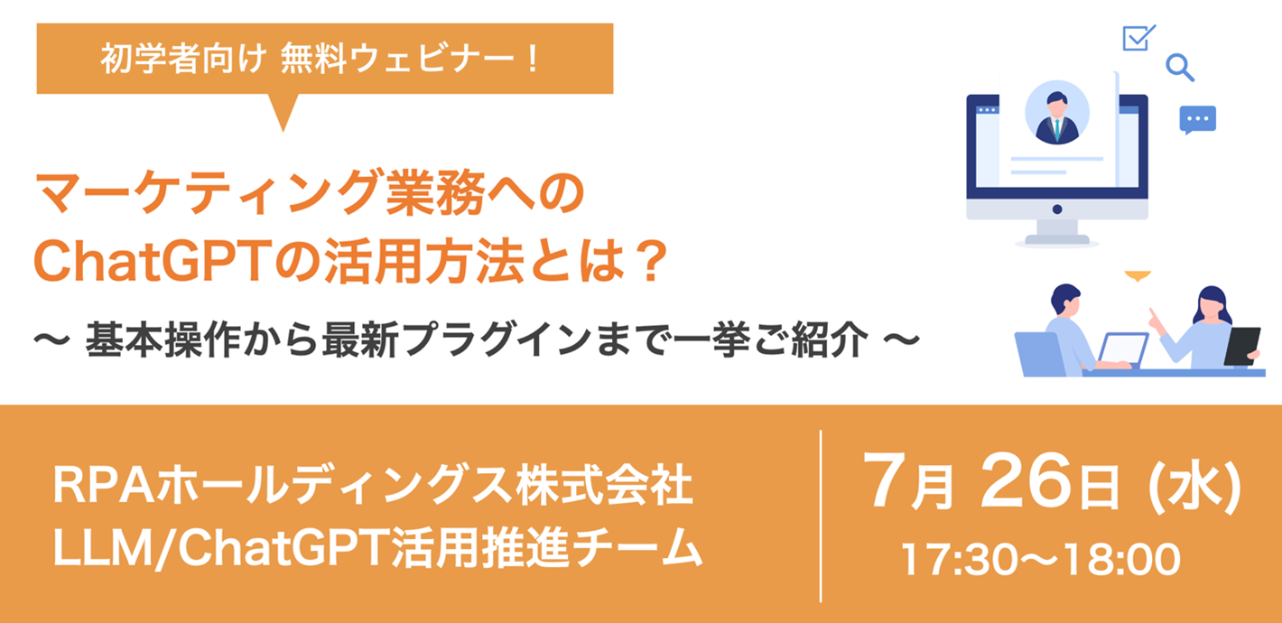 RPAホールディングス(本社:東京都港区、代表取締役:高橋 知道、以下「RPAホールディングス」)は、無料のオンラインセミナー「マーケティング×ChatGPTウェビナー – 基本操作から最新プラグインまで一挙ご紹介」を開催致します。
