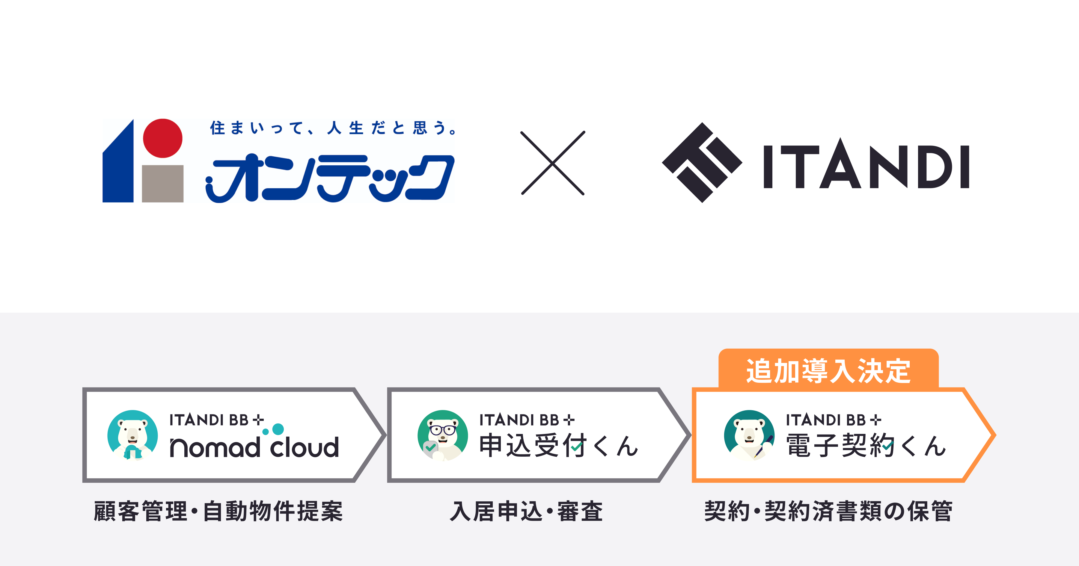2023年7⽉より、イタンジは、管理⼾数約25,000⼾のオンテック全18店舗に、イタンジが提供する不動産関連電⼦契約システム「電⼦契約くん」を導⼊いたします。