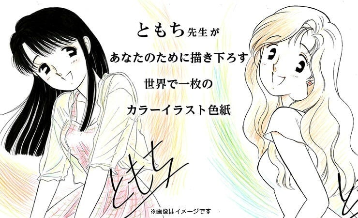 今回は、代表作に「だいすき!」「愛をあげよう」を持つともち先生によるセミオーダーのカラーイラスト色紙の販売を開始いたします。また、キャラクターのリクエストに応えて描き下ろすセミオーダーのカラーイラスト色紙に加えて、「愛をあげよう」から各限定1枚の販売となる完成品カラーイラスト色紙(3種)の2つの商品をラインナップに追加しております。