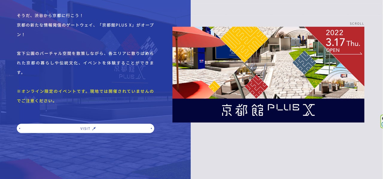 ・「京都館PLUS X」は、東京駅前の再開発により2018年に閉館した情報発信拠点「京都館」に代わる新たな情報発信の場として、「渋谷区立宮下公園 Powered by PARALLEL SITE」(渋谷区の後援のもと、大日本印刷株式会社、一般社団法人渋谷未来デザイン、宮下公園パートナーズが共同実証事業として運営するバーチャル空間)内に2022年3月17日にオープン。