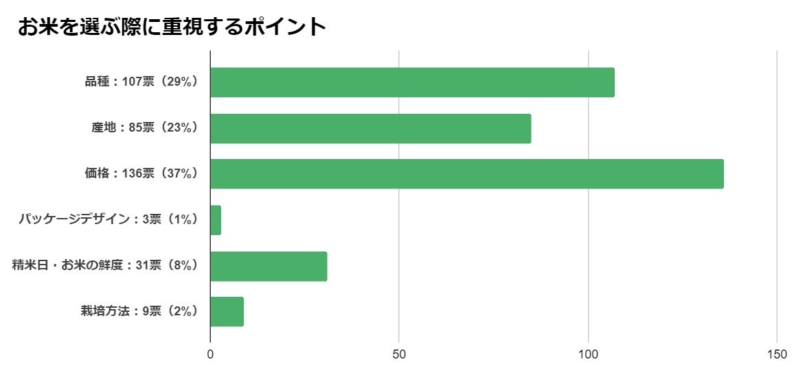 お米選びで重視するポイントは1位が「価格」、2位が「品種」、3位が「産地」でした。この上位3つで全体の9割を占めました。