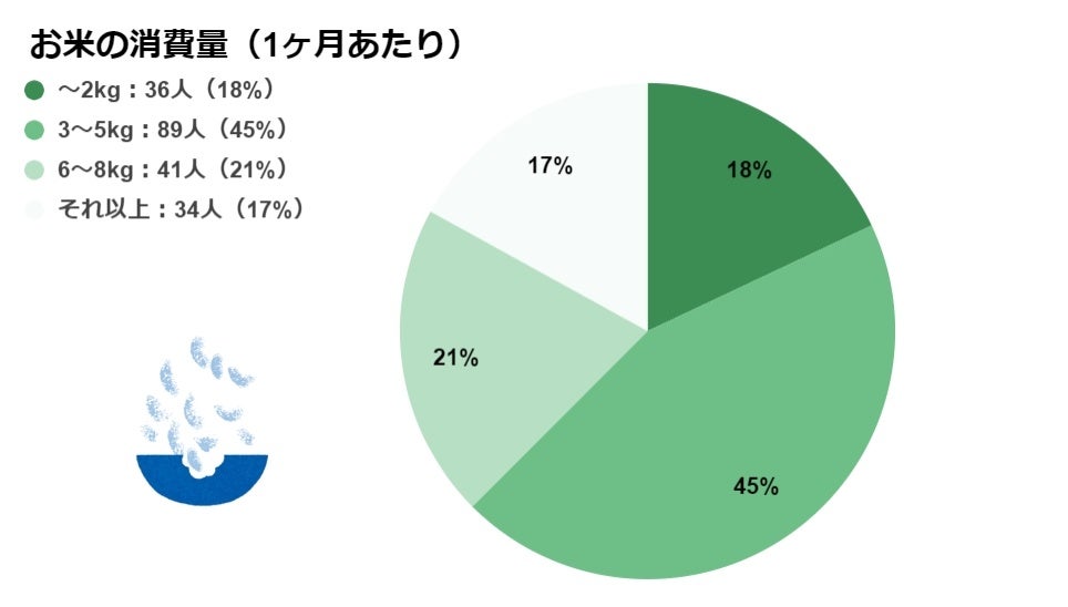 1ヶ月あたりのお米の消費量は「3~5kg」が最多の89人で、約半数(45%)を占めました。それ以外はほぼ同じ割合でいずれも20%前後です。