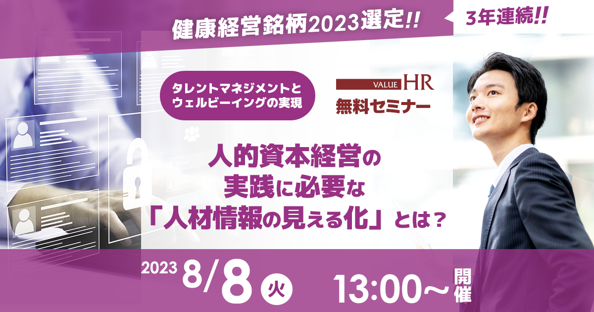 今回のセミナーでは、タレントマネジメントシステム「カオナビ」を活用した人材情報の管理方法と、経済産業省と東京証券取引所が共同で選定する「健康経営銘柄」に3年連続(2021~2023)で選定を受けたバリューHRが提供する健康管理システムの紹介をいたします。