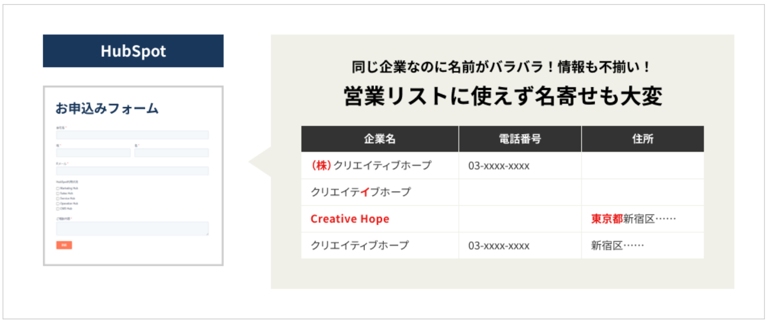 DX(デジタルトランスフォーメーション)改革が進む中、企業は CRMやマーケティングツールを活用して顧客データを集約・管理することが求められています。しかし、この過程で、企業情報の重複や不整合が生じ、営業部門やマーケティング部門の業務効率が低下する問題が発生しています。更には顧客情報の品質が悪いと、効果的なセグメンテーションやターゲティングが難しくなります。その結果、名寄せ作業に多くの時間と労力が必要になり、他の業務への支障が生じています。当社では HubSpot を用いた業務システム開発の知見を活かし、企業情報クレンジングの解決策として『名寄せフォーミー』をリリースすることにいたしました。