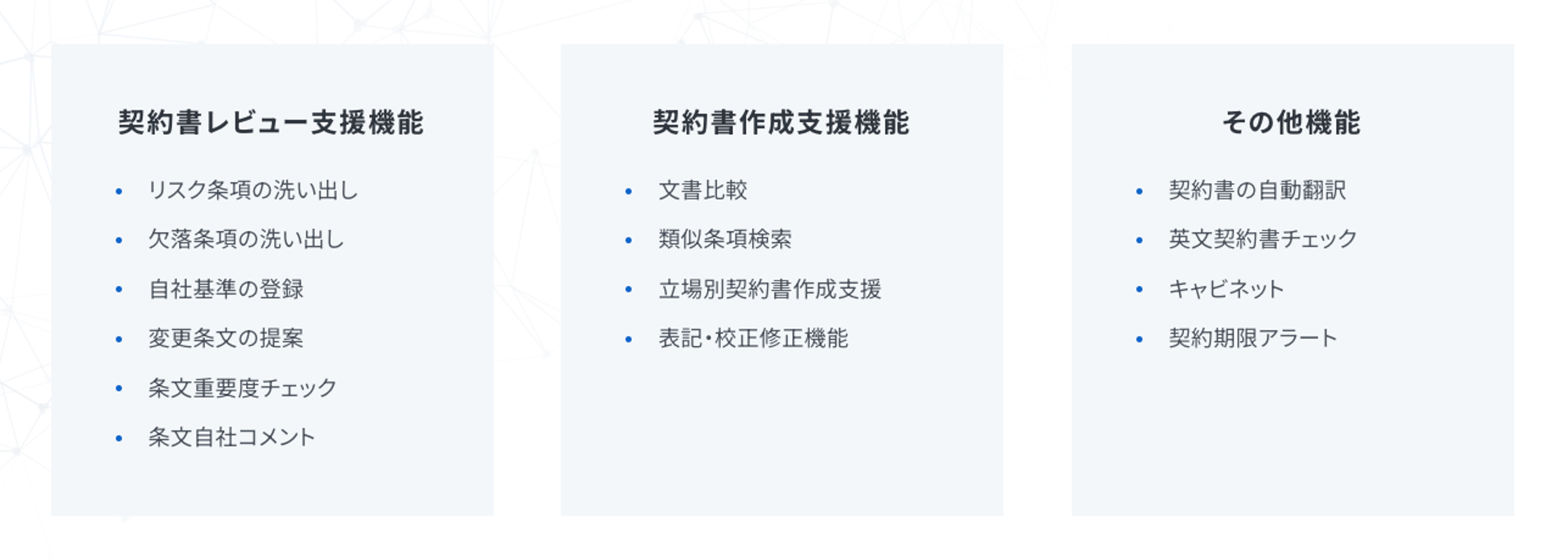 1.弁護士監修の高いAI精度:大手法律事務所出身の弁護士監修のもと精度の高いレビュー支援機能。