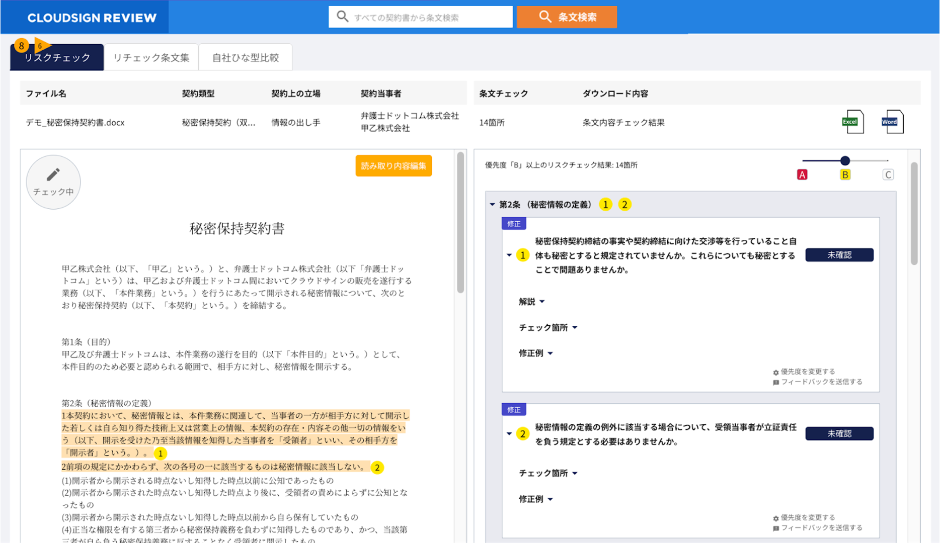 導入社数250万社以上、累計送信件数 1,500万件超の国内シェアNo.1の契約マネジメントプラットフォーム「クラウドサイン」が提供するAIによる契約書の自動レビュー支援サービスです。契約書ファイルをアップロードし、自社の立場を選択すると、AIが即座に不利な条項や抜けている条項を指摘し、欠落条項や要注意条項、解説などを自動表示します。専門弁護士が作成した解説や自社に有利な条文サンプルも表示されるため、高度な専門知識がなくても、レビューの工数を大幅に削減できます。