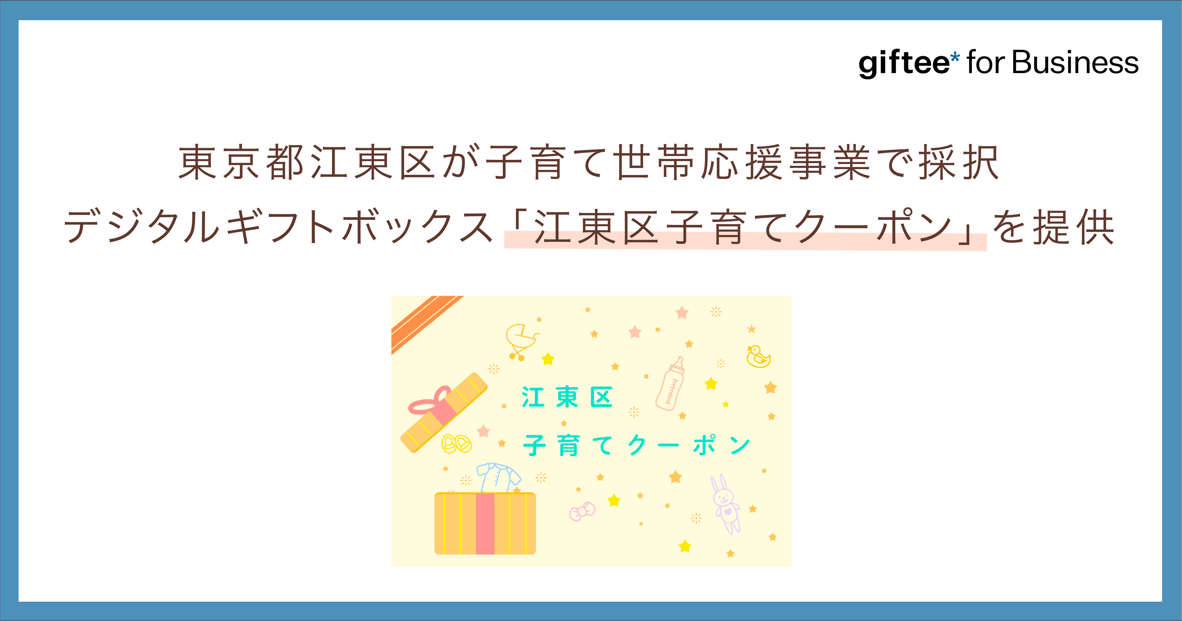 eギフトプラットフォーム事業(※1)を展開する株式会社ギフティ(本社:東京都品川区/代表取締役:太田 睦、鈴木 達哉/以下、ギフティ)は、デジタルギフトを活用した法人および自治体向けサービス「giftee for Business」(※2)を、東京都江東区が令和5年度高校生相当年齢以下(※3)のこどもを対象に実施する「子育て世帯応援事業」に採択いただきましたので、お知らせいたします。これに伴い、ギフティが、「giftee for Business」の主力プロダクト「giftee Box®」(※4)を江東区オリジナル仕様にカスタマイズしたデジタルギフトボックス「江東区子育てクーポン」として提供し、2023年7月21日(金)より対象者へ本ギフトの配付が開始されます。なお、本事業は、ギフティ、日本旅行ビジネスソリューションズ株式会社(本社:大阪府大阪市/代表取締役社長:髙橋 秀実/以下、日本旅行ビジネスソリューションズ)、株式会社ニッセン(本社:京都府京都市/代表取締役社長:羽渕 淳/以下、ニッセン)、株式会社ディーエムエス(本社:東京都千代田区/代表取締役社長:山本 克彦/以下、ディーエムエス)の4社により構成する「株式会社ギフティ共同事業体」(以下、ギフティ共同事業体)として江東区より受託し、ギフティが本受託事業における全体統括を行っています。