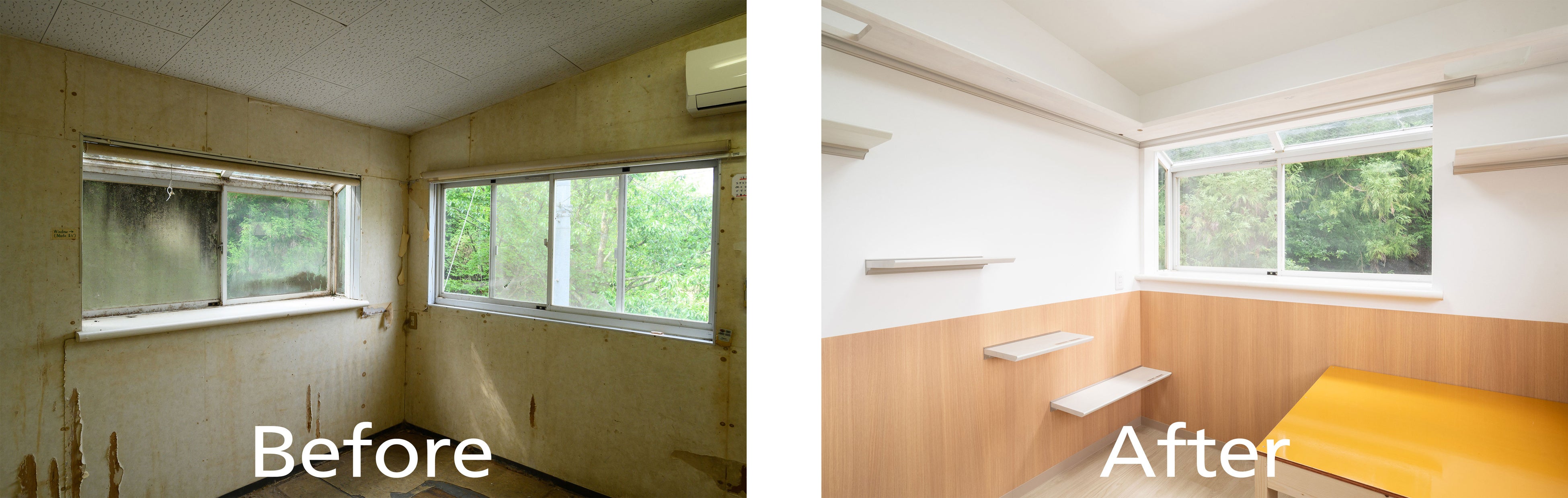 長期間、物置きとして放置されていた空間をわんちゃん、ねこちゃんも人も笑顔になれる空間へとリフォームを実施。リフォームしたお部屋は「Smile room」と名付け、わんちゃん、ねこちゃんがストレスなく楽しく暮らせるように工夫を凝らしました。