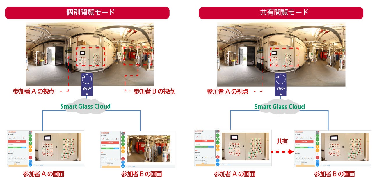本部側で参加する複数のPCやタブレットが自由に視点を動かしながら閲覧できる「個別閲覧」機能の他、任意のPCが見ている360°映像を他の参加者にも共有する「共有閲覧」の機能があり、より高度な複数人での現場支援や現場視察等にご活用いただけます。