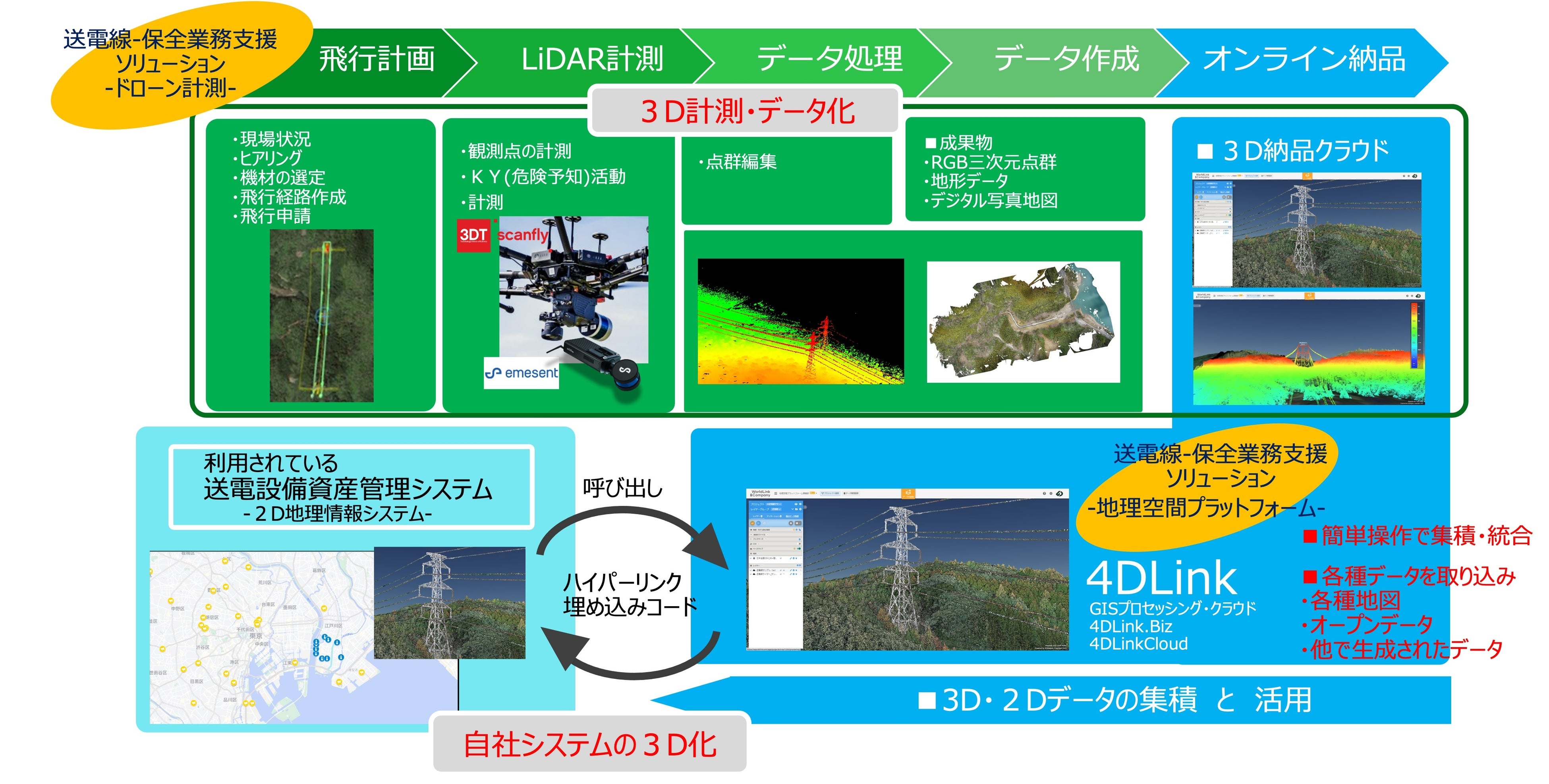 本ソリューションは、鉄塔および送電線と樹⽊との離隔状況の把握を⽬的としており、UAV(ドローン)にレーザスキャナ(LiDAR)とRGBカメラを搭載し計測します。これにより、有人航空機を使ったデータ取得⼿法と比べて、特定箇所のより⾼精細な3Dデータを簡便に取得することができます。併せて、取得されたデータは当社の「地理空間情報プラットフォーム4DLink」を介して3Dデータのオンライン納品を行い、現況や伐採前後の変化を関係者と情報共有すると共に既に利用されている設備資産管理システムと連携することで、メンテンナス分野のDXを実現します。