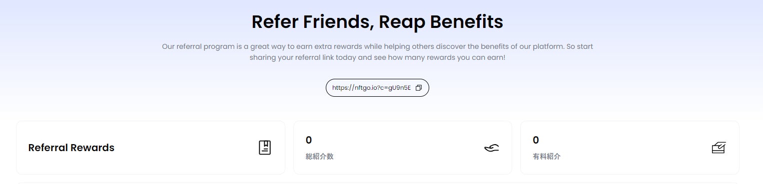 NFTGoのPremiumサービスを購読中の方で、サービスを友人やコミュニティに紹介することでキャッシュバックや使用期間に対するリベートが行われるキャンペーンもご用意しています。