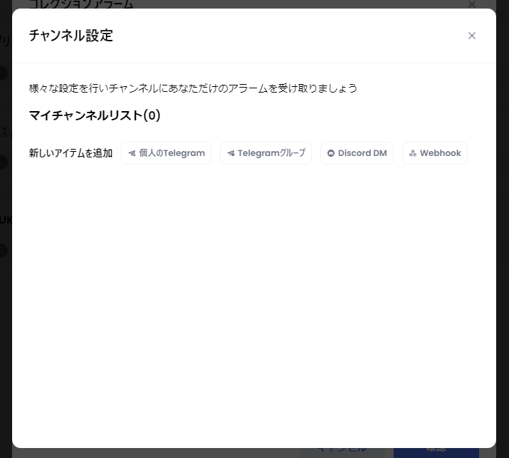 コレクション価格の変動、取引量の変動、また自身が追跡した特定のウォレットの取引活動など、ユーザーがカスタムに条件を設定するとSNSで通知を受け取れるサービスです。Premiumサービスユーザーの場合、50個までアラートを設定可能になります。