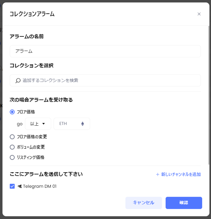 アラートの設定では、コレクションのフロア価格、リスト価格、取引量の変化など様々な条件でカスタマイズ可能