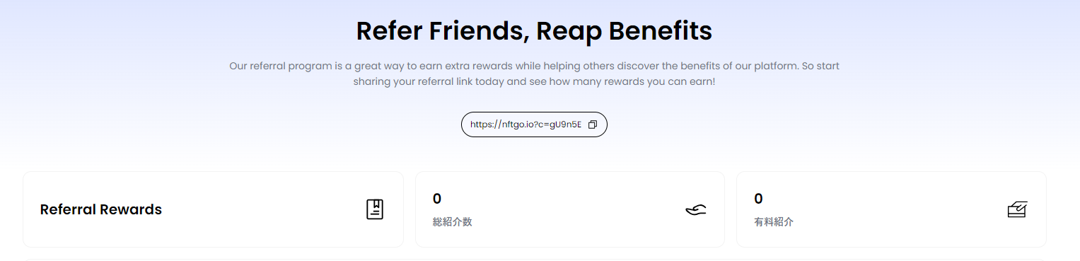 NFTGoのPremiumサービスを購読中の方で、サービスを友人やコミュニティに紹介することでキャッシュバックや使用期間に対するリベートが行われるキャンペーンもご用意しています。