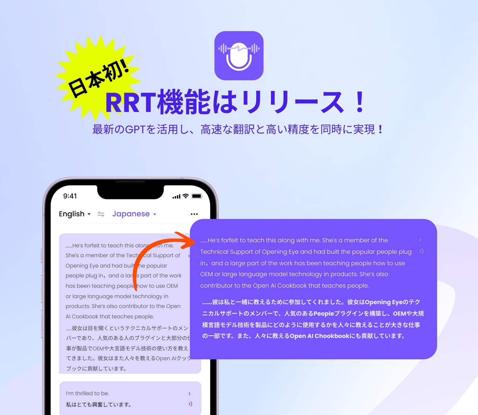 Felo Translatorは世界で初めてGPT技術を応用した同声通訳アプリです。今話題のGPT技術を活用し、瞬間的に言語翻訳を生成します。さらに、その文章を元に、文体・文脈を考慮したより正確な二次翻訳を行う「RRT」(RealTime ReWrite Translate)機能により、高速な翻訳と高い精度を同時に実現することができます。