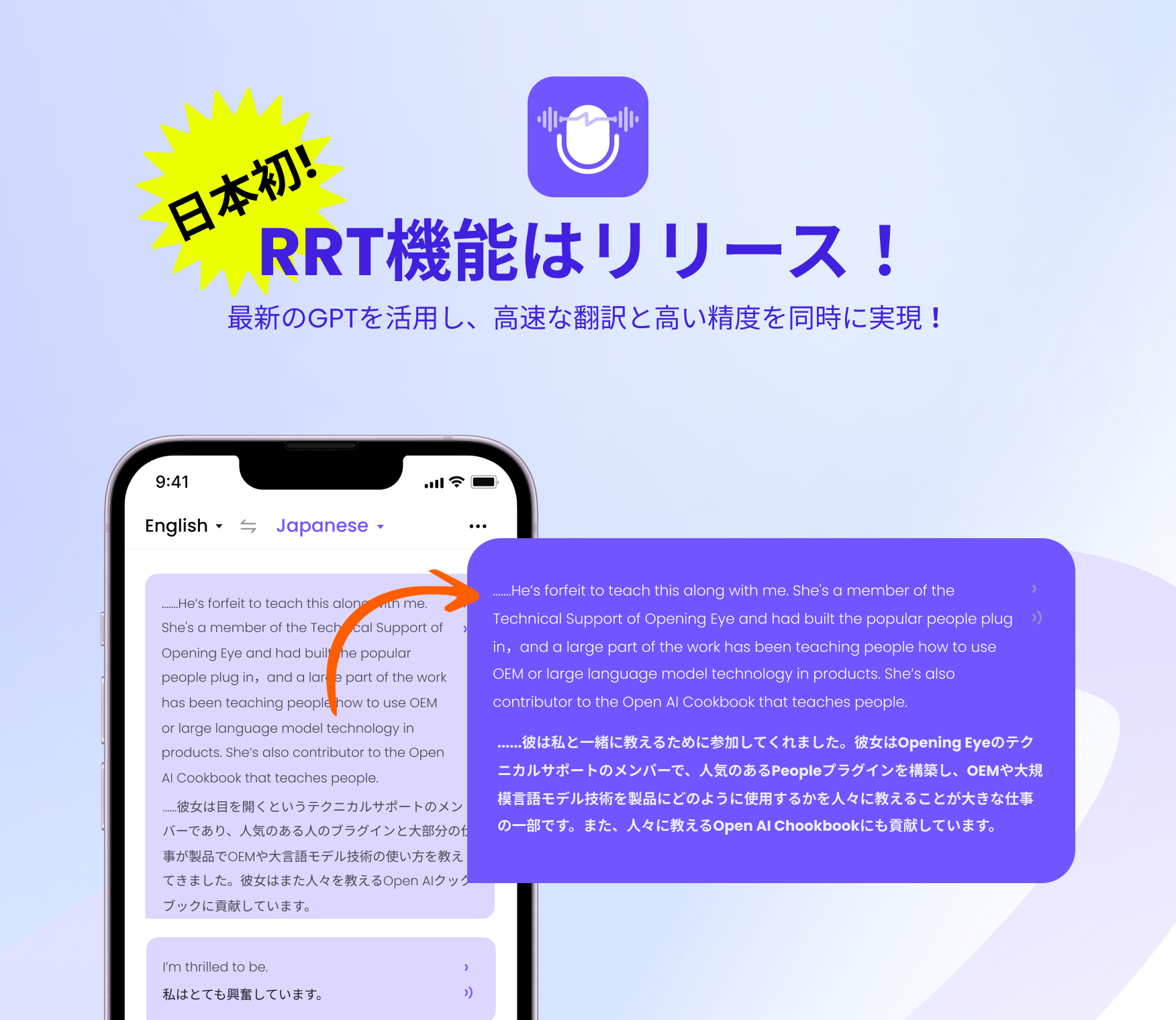 Felo Translatorは世界で初めてGPT技術を応用した同声通訳アプリです。今話題のGPT技術を活用し、瞬間的に言語翻訳を生成します。さらに、その文章を元に、文体・文脈を考慮したより正確な二次翻訳を行う「RRT」(RealTime ReWrite Translate)機能により、高速な翻訳と高い精度を同時に実現することができます。