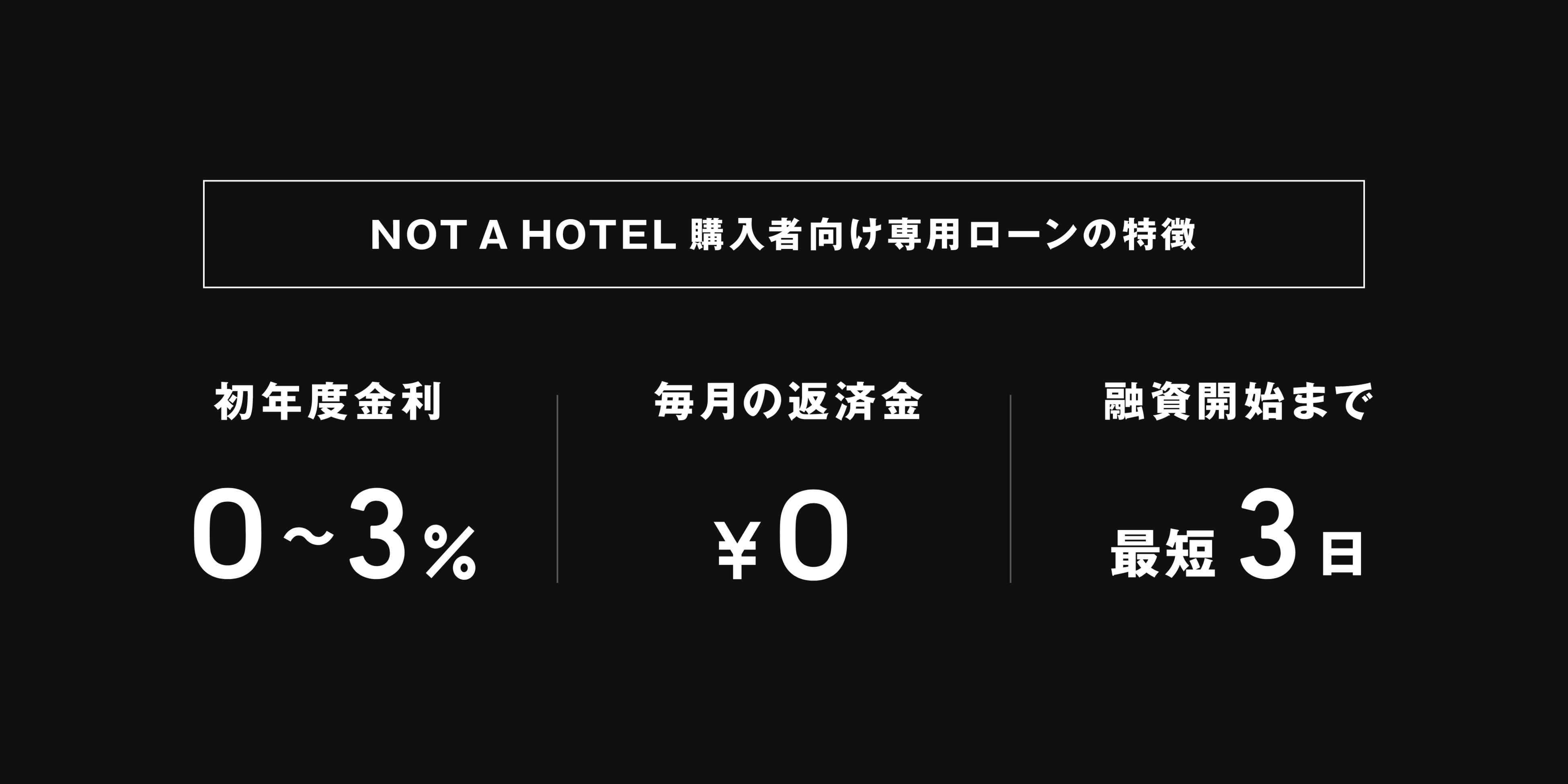 NOT A HOTELは昨年9月より物件の販売を開始していますが、Fintetechとの提携により従来では融資が難しかった不動産の共同購入に対してもローンの提供を実現しました。Fintertechとの提携を通じて、世の中のデジタル資産の有効活用を促進し、「すべての人にNOT A HOTELを」のミッションのもと、より多くの人にNOT A HOTELをご利用いただける世界をつくっていきます。