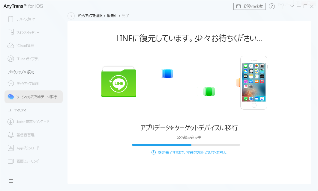 7.LINEトーク履歴をデバイスに復元するプロセスが始まります。しばらくお待ちください。復元完了までデバイスの接続を切断しないでください。
