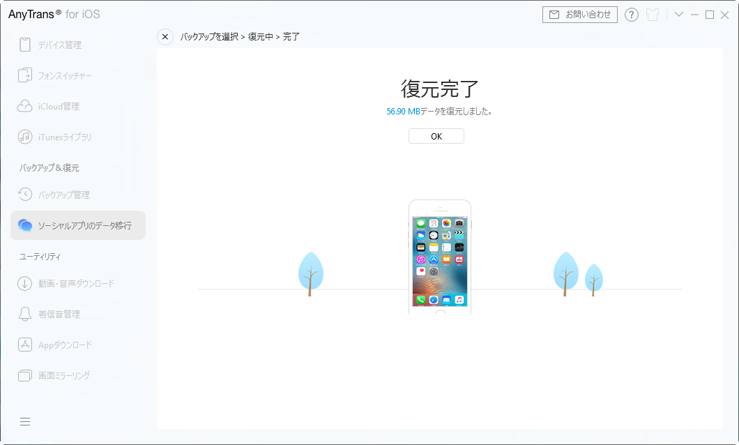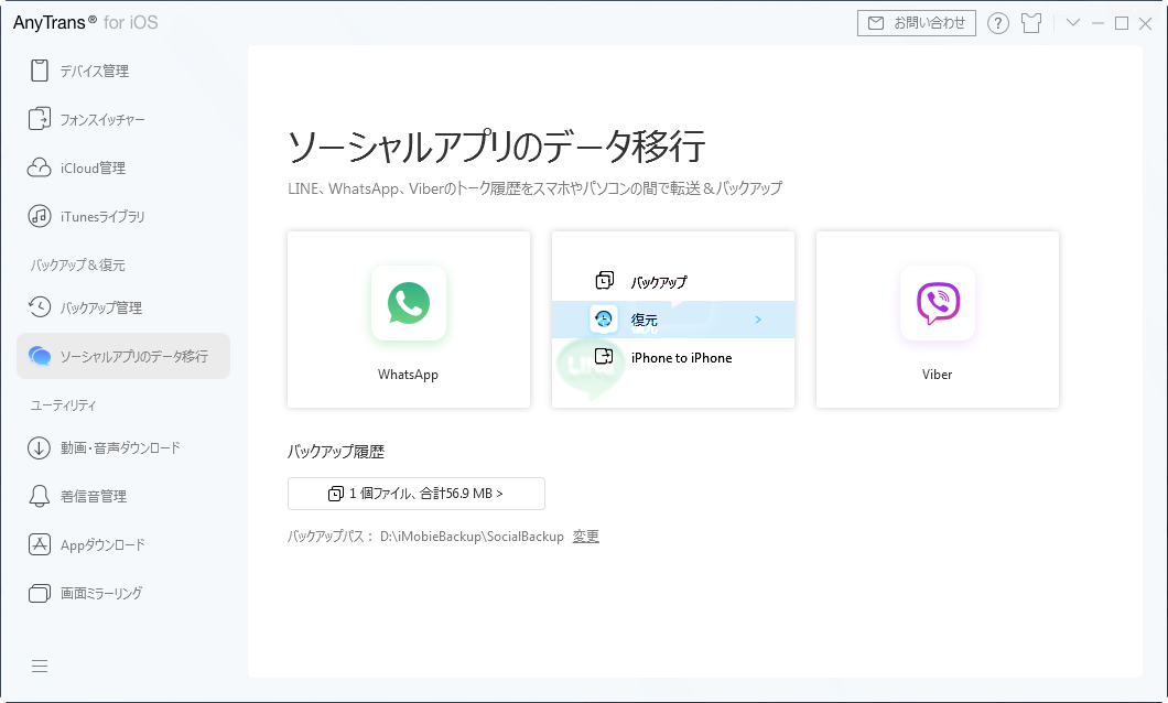 AnyTransはソーシャルアプリのデータのバックアップとデータから復元機能が搭載されているiOSデバイス向け専用のデータ転送・管理ソフトです。新バージョンがリリースされた後、データ復元速度も向上させます。