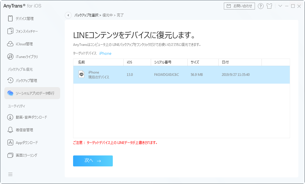 6.AnyTransは自動的にパソコン上のバックアップデータを表示してから、復元したいバックアップを選択したら、「次へ」をクリックします。