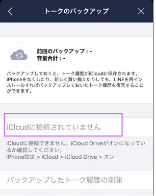 2.「iCloudに接続されていません」と表示されると、iCloud DriveでLINEの設定が有効になっていないと意味して、バックアップできません。