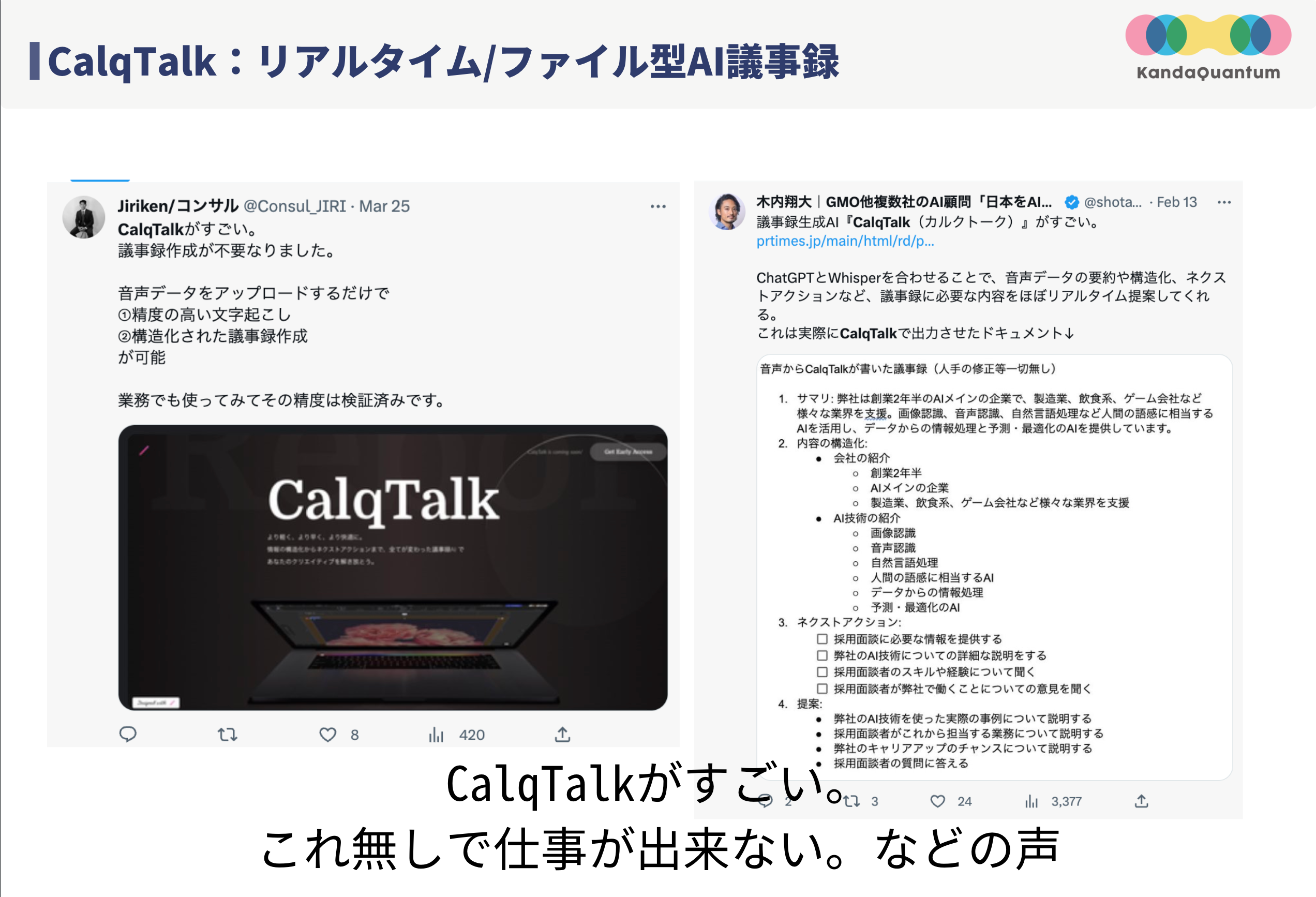 当社は「CalqWorks」という国内最大級のジェネレーティブAI特化プラットフォームを開発し、1200社以上が事前登録し、個人アカウント、法人アカウント合わせて2500アカウント発行済みの巨大なプラットフォームへと成長をしております。