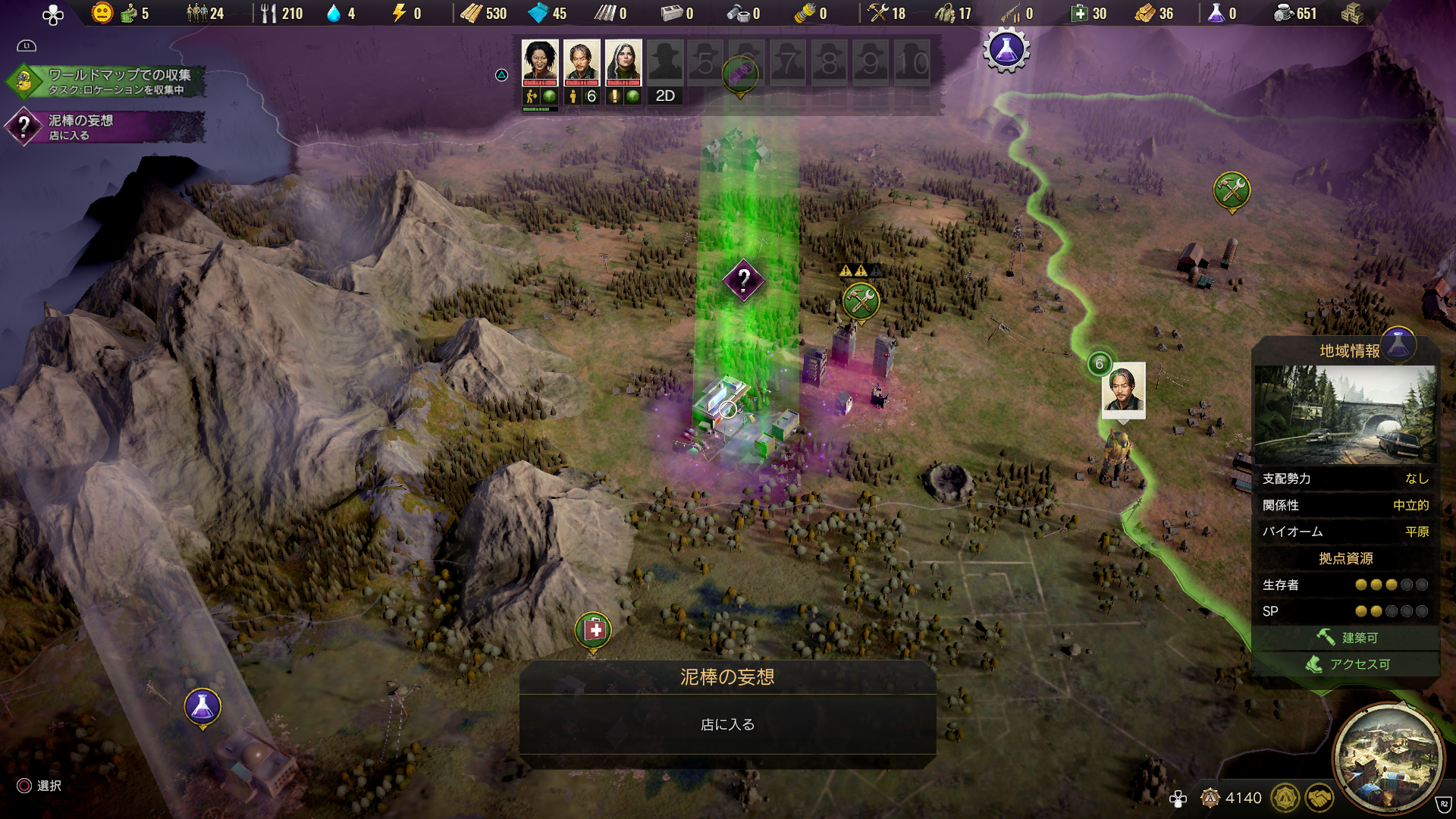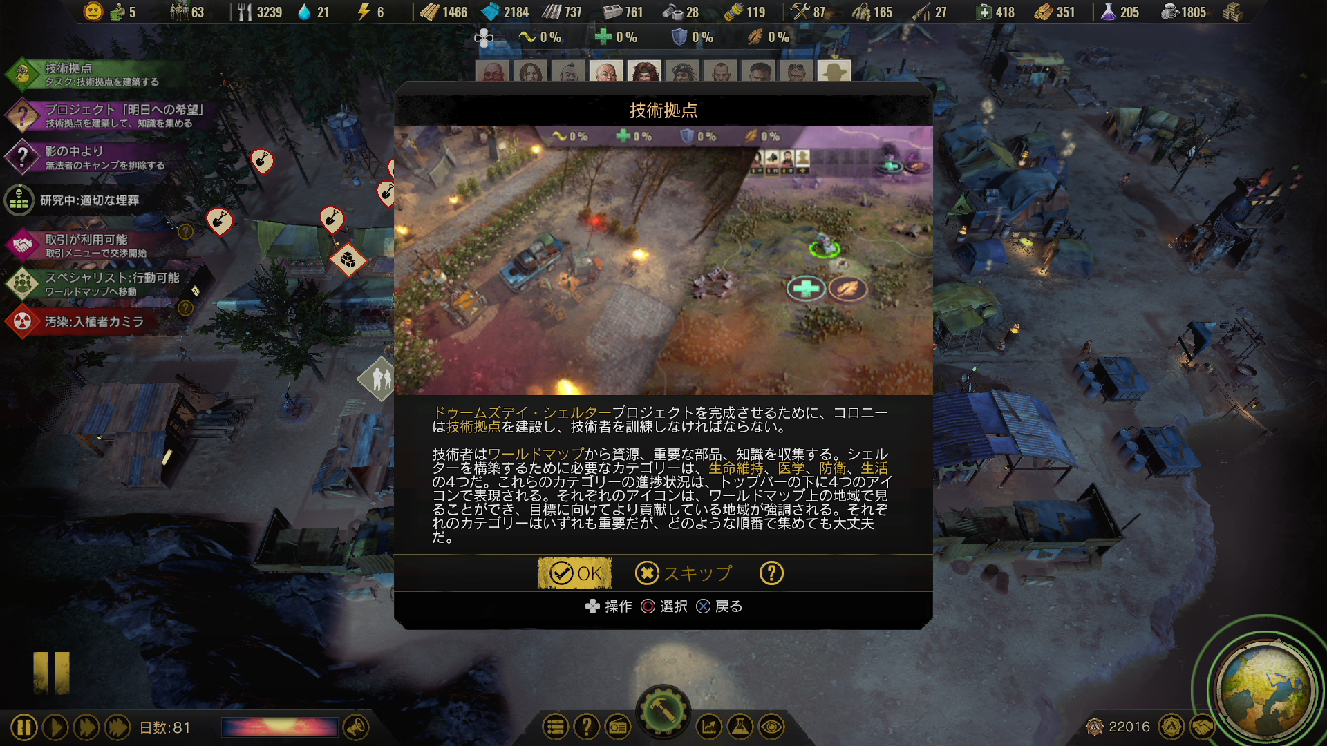 コロニーで起こるクエストの中でも、長期間に渡ったプレイが可能なのが「メインクエスト」です。メインクエストでは、コロニーの外に知識や資源を集めるための“技術拠点”を建設し、ワールドマップを広く使った物語が展開していきます。