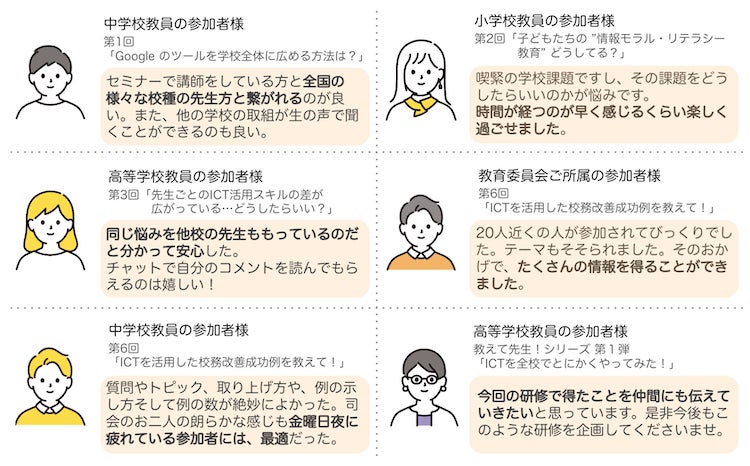 毎回、皆様から寄せられた学校のICT活用についての質問やお困りごと、事例共有をテーマに、講師や参加者の皆様でざっくばらんに情報をシェアするコミュニティです。