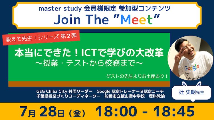毎週金曜日18:00~18:30に Google Meet™ で開催中の「Join The “Meet”」。『教えて先生!シリーズ』は、特別回として15分拡大バージョン【18:00~18:45】でお送りします!