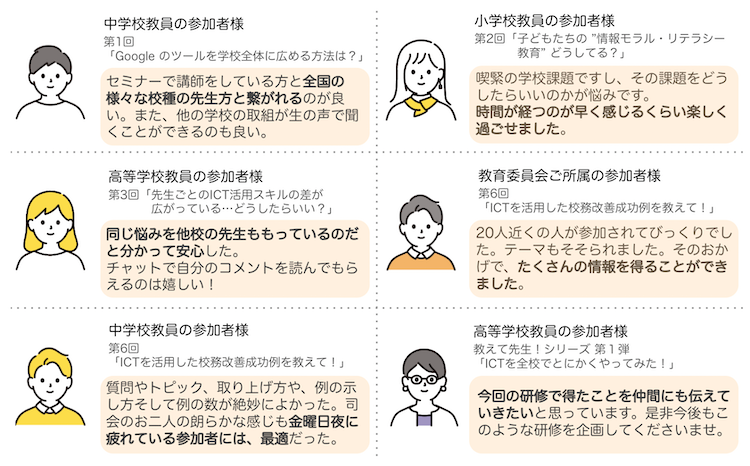 毎回、皆様から寄せられた学校のICT活用についての質問やお困りごと、事例共有をテーマに、講師や参加者の皆様でざっくばらんに情報をシェアするコミュニティです。