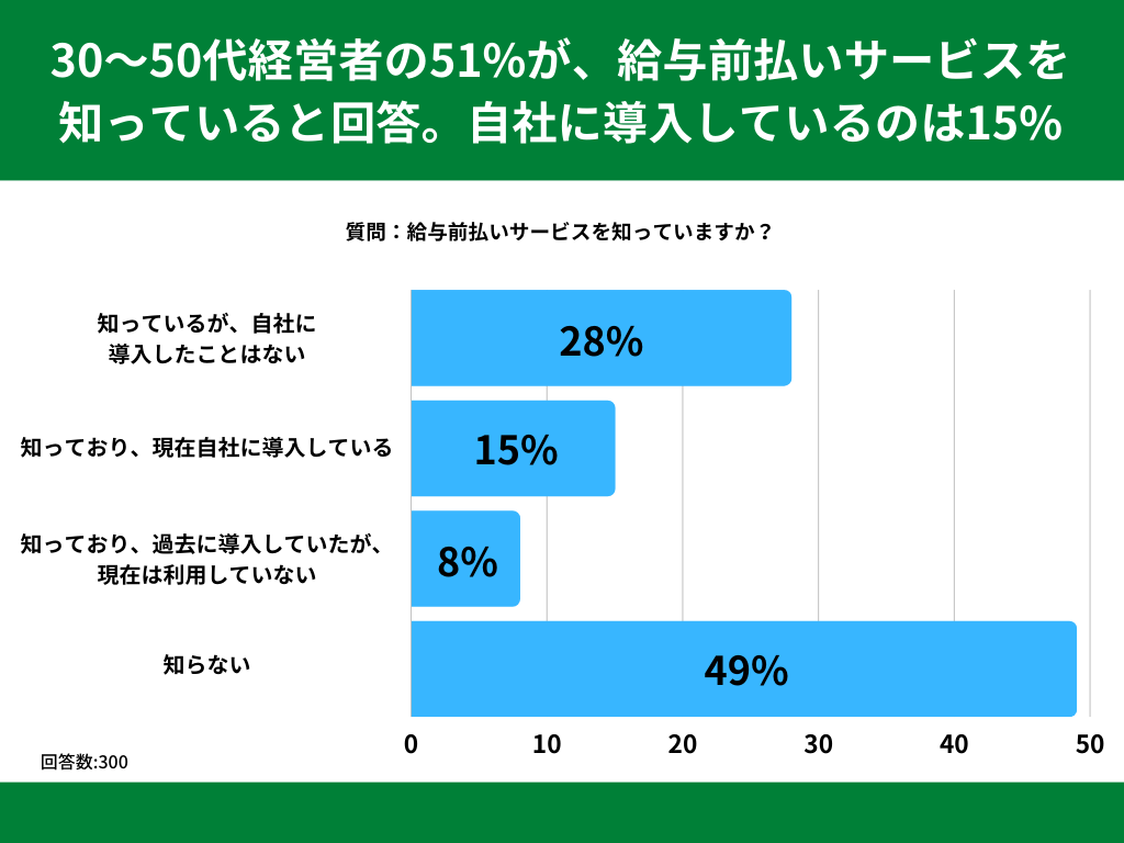 30代〜50代の男女を対象とした「給与前払いサービスを知っていますか?」というアンケートで最も多かった回答は「知らない」で49%でした。