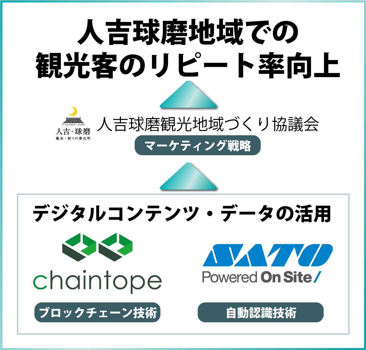 実証事業では、人吉球磨地域のブランド力、Chaintopeのブロックチェーン技術、サトーの自動認識技術を掛け合わせることにより、デジタルコンテンツ・データを活用した人吉球磨地域での観光客のリピート率向上を目指します。