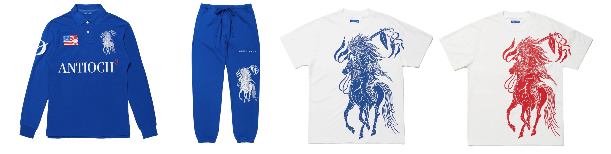 AGNES KRUEL is a brand that focuses on classic Americana, with a twist. Creating “Contemporary Americana” clothing with a dash of otaku culture, obscure philosophy, and a plethora of visual symbols that could lead you down a Wikipedia spiral in an attempt to decode the references. Yet, in-depth analysis is not obligatory. One glance at the brand’s offerings and you’ll instantly realize its inherent appeal. The latest collection upholds the brand’s philosophy, incorporating one of the most recognized symbols of Americana, Ralph Lauren’s Polo logo, but with the unique twist from the mind of Agnes Kruel.