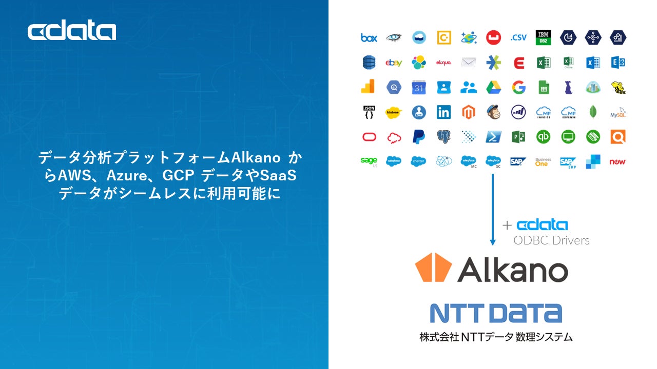 2023年7月24日、CData Software Japan 合同会社(本社:アメリカノースカロライナ州、日本オフィス:宮城県仙台市、代表社員 職務執行者:疋田 圭介、以下CData)は、株式会社NTTデータ数理システム(本社:東京都新宿区、代表取締役社長:箱守 聰、以下NTTデータ数理システム)が提供するデータ分析プラットフォーム『Alkano』が『CData ODBC Drivers』と製品連携を開始したことを発表します。本連携により、Alkano からAWS、Azure、GCP、IBM などのクラウドインフラサービスやSaaS データにシームレスにアクセスし、企業のデータ活用の効率が高まります。