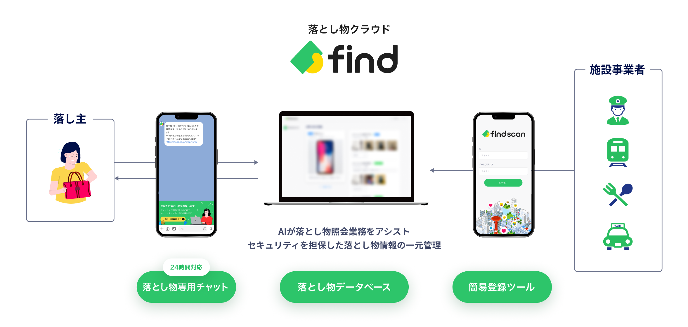 落とし物クラウドfindは、落とし主の「連絡するだけでも大変」「探したくても見つからない」という悩み・不安を、テクノロジーの力によって解決するサービスです。落とし物対応・管理を行う法人様が導入することで、自社の業務効率化、並びにユーザー様の満足度向上に貢献します。