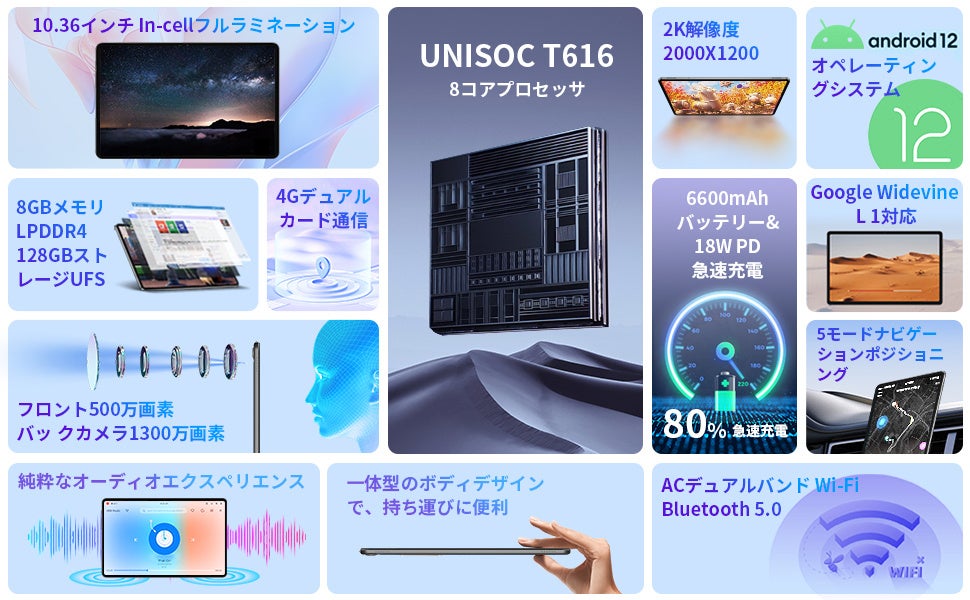 【最新のAndroid 12搭載の超高性能8コアタブレット】こちらのタブレットは、最新のAndroid 12を搭載しています。最新のアプリやゲームを快適に楽しむことができます。また、高度なセキュリティ技術を使用し、プライバシーを守りながら安心してご利用いただけます。パープルライト展示錐高性能T616、8コア2.0Ghz CPUを搭載し、高速かつ省エネな処理が可能です。さらに、「Mali-G57」の高性能GPUも搭載され、グラフィック処理も強化されています。ゲームやビデオのスムーズな再生を楽しめます。さらに、8GBのRAMと128GBの高速ストレージが搭載されています。最大1TBまでのメモリ拡張も可能で、ビデオ、電子書籍、ゲーム、音楽などを心配することなくダウンロードできます。
