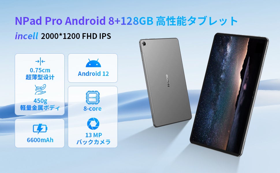 【6600mAh大容量+5/13MPカメラ+軽量10インチGMSタブレット】6600mAhの大容量バッテリー搭載で、通勤中や出張時でも映画や電子書籍、音楽などを長時間楽しめます。1300万画素のリアカメラと500万画素のフロントカメラで美しい風景や会話を撮影できます。10.4インチの軽量タブレットはGMS認証済みで、お気に入りのアプリにGoogle Playストアから簡単にアクセスできます。NPad Proは薄さ7.5mmでポータブルな全金属デザイン。重さ440gで持ち運びに便利です。デュアルマイク内蔵でワイヤレス投影にも対応しており、PSE&TELEC認証も取得しています。