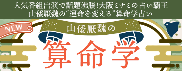 数々の人気番組やメディア出演で話題を集める山倭厭魏(やまとおうぎ)による本格算命学サイトが遂に登場!古代中国から伝わる「算命学」を用いて詳細な命式を作成し、あなたの運勢や宿命、気になるあの人とのご縁や相性も明らかにします。鑑定歴30年の占い覇王・山倭厭魏の算命学を用いた細密鑑定をぜひご体験ください。