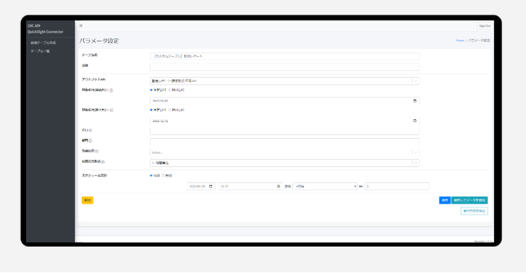 ZACのアウトプットAPIのデータ取得条件(引数)をアプリケーション上で指定しデータを取得できる機能です。