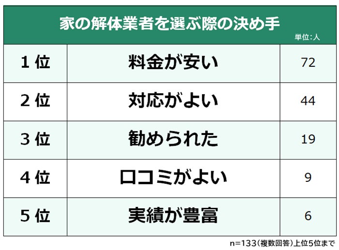 今回、一般社団法人あんしん解体業者認定協会( https://anshin-kaitai.or.jp/ )運営の解体無料見積ガイド( https://www.kaitai-guide.net/ )は、家の解体をした経験がある男女133人に「解体業者を選ぶ際の決め手」についてアンケート調査を実施。その結果をランキング形式でまとめました。