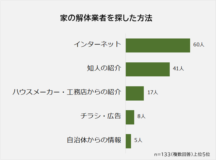 家の解体をしたことがある133人に「解体業者を探した方法」を聞いたところ、最も多かったのは「インターネット(60人)」でした。