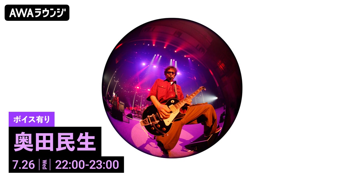 AWA株式会社(本社:東京都港区、代表取締役CEO:冨樫晃己)が運営する、サブスクリプション型(定額制)音楽ストリーミングサービス「AWA(アワ)」は、7月26日(水) 22:00~23:00に、奥田民生のAWAラウンジを開催いたします。