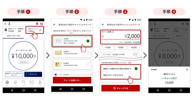 ・内容:「おサイフケータイ®」機能が搭載されたAndroid版「楽天Edy」アプリにて「楽天Edy」を「楽天キャッシュ」へチャージすることができます。