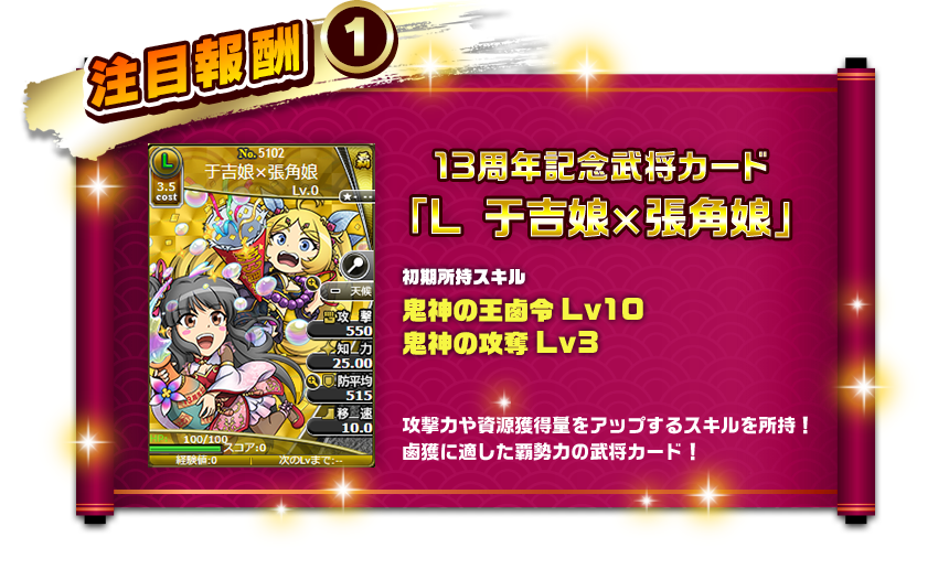 初日から13周年記念武将カード「于吉娘×張角娘」 が貰えます。