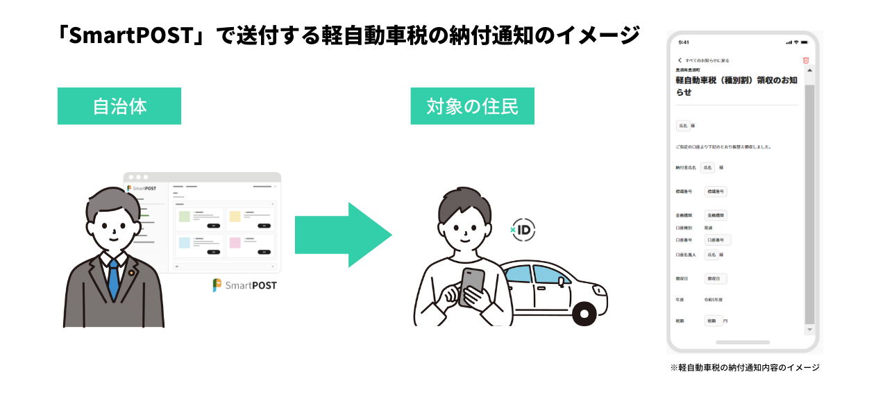 本取組は、都農町がおこなう実証実験として2023年4月から実施されています。都農町は4月から本取組に関する説明や告知を町民へ行い、6月に「SmartPOST」から対象となる町民のスマホにインストールされた「xIDアプリ」へ、軽自動車税の納付通知を個別に送付しました。