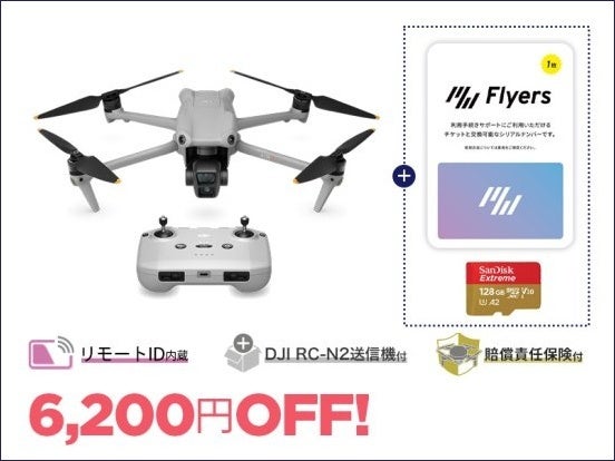 DJI Air 3 本体にディスプレイ付き送信機や3本のバッテリー、バッテリー充電ハブ、ショルダーバッグなどが付いた Fly More コンボに、全国のフライトエリアでの飛行手続きが依頼できる「Flyers」フライトチケット1枚とメーカー推奨のmicroSDカード(128GB)を合わせたオリジナルセットです。